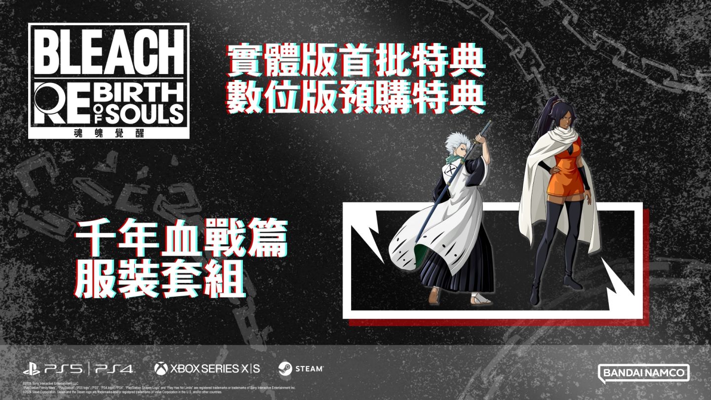 首批購買實體版或預購數位版的玩家,將可獲得電視動畫《BLEACH 千年血戰篇》中,日番谷冬獅郎與四楓院夜一的服裝套組特典。