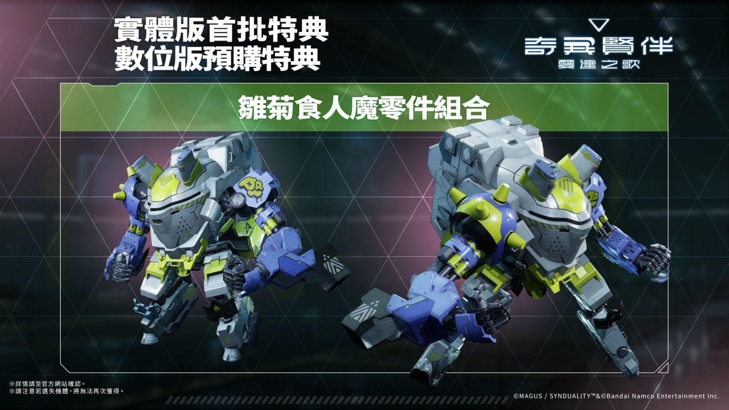 首批購買實體版或預購數位版的玩家將可獲得動畫《奇異賢伴 黑色天使》中由主角奏多所搭乘的機體「雛菊食人魔」的零件組合。