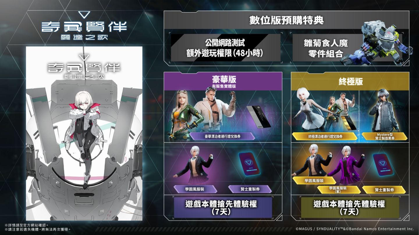 玩家只要購買數位終極版或數位豪華版,即可獲得最多可提早 7 天搶先遊玩遊戲的「遊戲本體搶先體驗權」。此外,玩家只要預購數位標準版、數位豪華版或數位終極版,即可獲得數位版預購限定特典「公開網路測試額外遊玩權限(48 小時)」,可於日後公開舉行的公開網路測試中獲得最長可額外遊玩 48 小時的權限。即刻預購本作,搶先體驗《奇異賢伴 愛達之歌》。