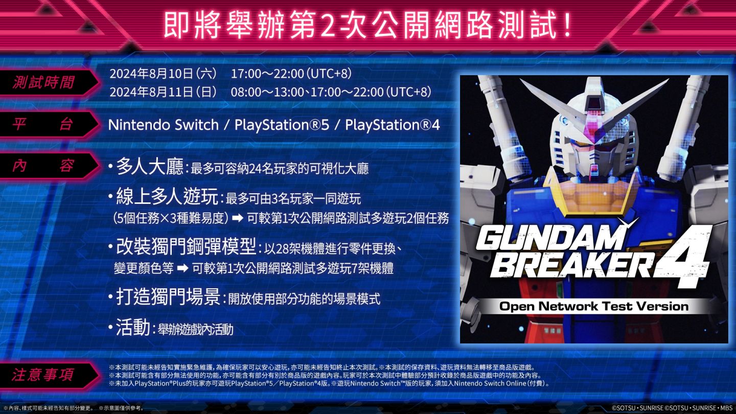 萬代南夢宮娛樂宣布,預計於 2024 年 8 月 29 日發售的 Nintendo Switch/PS5/PS4/Steam 版《GUNDAM 創壞者4》,即將於 2024 年 8 月 10 日(六)、11 日(日)在 Switch/PS5/PS4平台上舉行第 2 次公開網路測試。實體特典及遊戲情報也已同步公開。