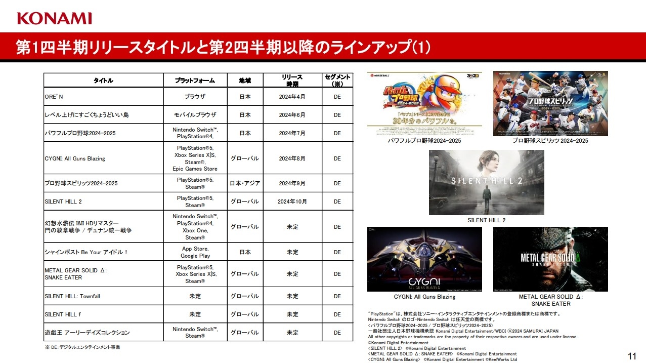 據官方表示,在接下來的 7~9 月中,除了有已經於 7 月 18 日在 PS4/Nintendo Switch 發售的《實況野球》系列 30 週年紀念作《實況野球 2024-2025》(パワフルプロ野球2024-2025)外,還有 KeelWorks 開發、預定 8 月 6 日起在 PS5/PS4/Nintendo Switch/Xbox Series X|S/Xbox One/Steam 等平台推出的射擊遊戲《CYGNI:All Guns Blazing》,跟預定 9 月 19 日起在 PS5/Steam 上推出,主打真實感的系列 20 週年紀念《職棒野球魂 2024-2025》(プロ野球スピリッツ2024-2025)。