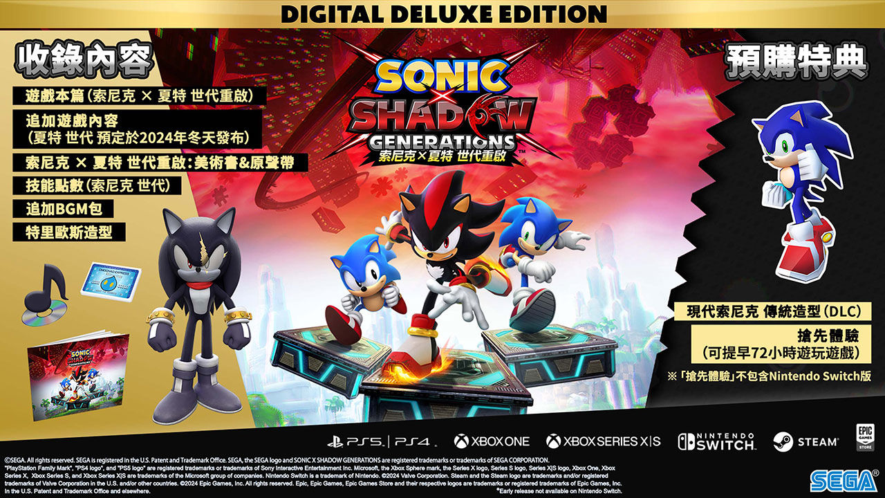 在線上商店 Nintendo eShop 中,目前已開放進行 Nintendo Switch 版本之預約。數位版的預約特典為下載內容「現代索尼克 傳統造型」。本次則公開了 DLC「現代索尼克 傳統造型」的外觀預覽。