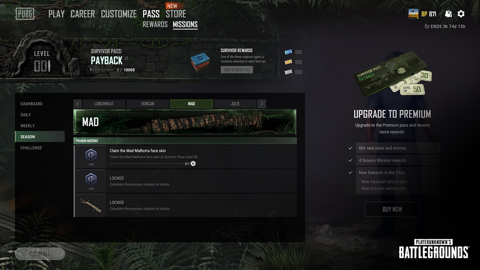 在採納了玩家對於生存通行證的種種意見後,本次隨著賽季推出了全新的「生存通行證:血債血償」─ 捨棄了社群任務與逐步開放的進度任務,改為更為簡單的賽季任務與一次開放的 4 種特殊造型獎勵系列任務,並讓玩家能以遊玩遊戲獲得更多的 XP,加速升級的效率。