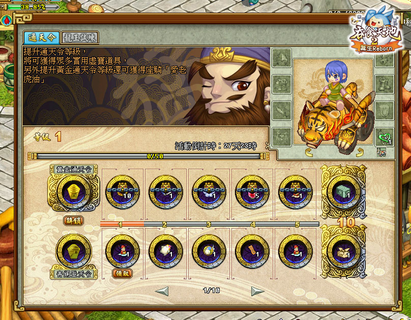 此階段又以週為單位,每週更新不同的任務,各位的豪取積分旅程也從此刻正式啟程,目標則是終極大獎!本期「通天令」的終極大獎是華麗又帥氣的坐騎「愛老虎油」,除了物法傷害各 +90 外,還能額外增加體質 20,移動速度 +13 更是少見的飛毛腿,至於日後每個月的終極大獎也將有所不同,除了座騎之外,還會推出華麗時裝,甚至強力武將,玩家可以多加參考,努力拚起來!