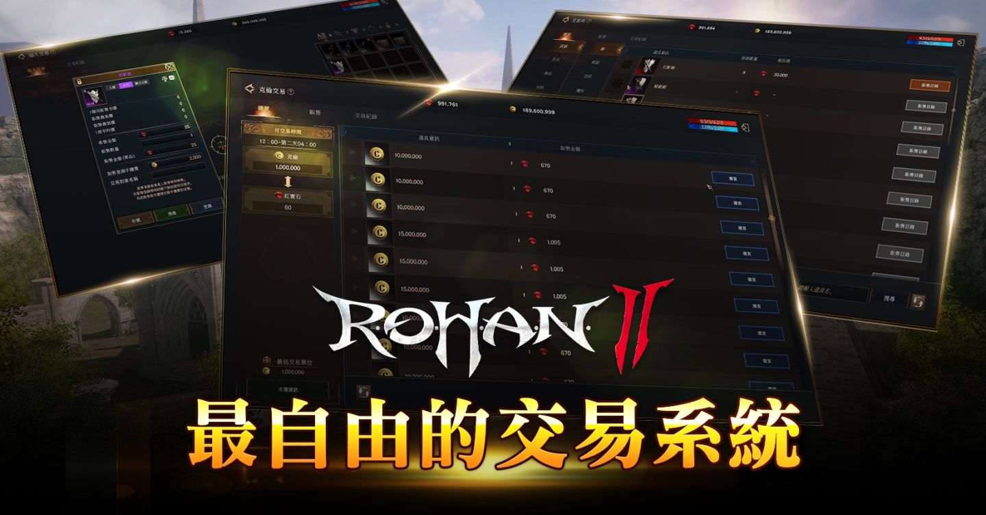 除了延續經典遊戲玩法 PVP系統、生死簿及裝備繼承系統等,還推出了獨特的經濟系統。此次《洛汗2》打造了全新的經濟體系,玩家可透過遊戲幣交易所、道具交易所及私人交易等功能,將遊戲幣以及狩獵獲得的裝備、道具轉換成商城幣,並使用商城幣與其他玩家再進行交易。