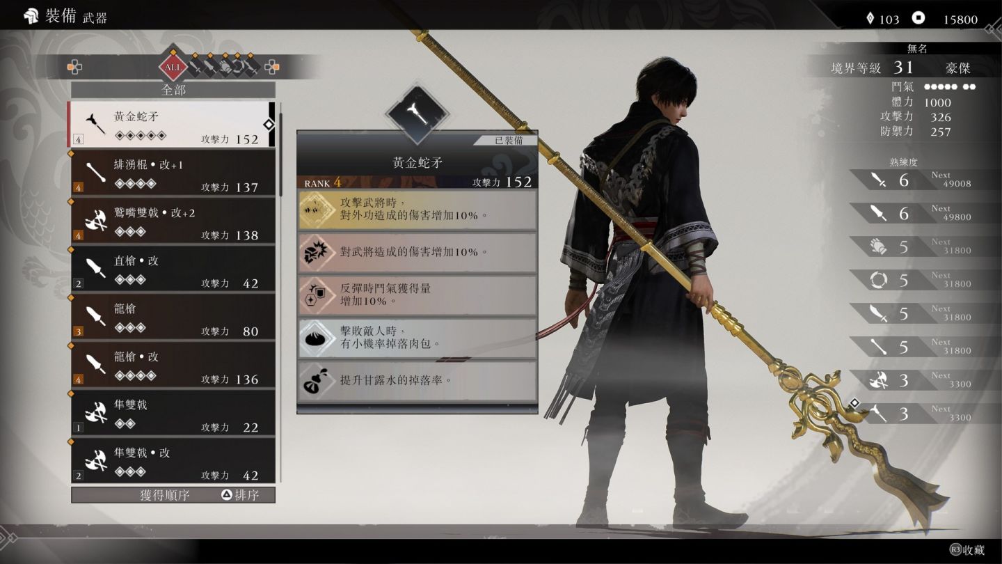 「黃金蛇矛」除了能增加對外功 10%的傷害外,還有能增加對武將的傷害、提升擊破武將時肉包的掉落機率等,是對初期到中期攻略遊戲很有幫助的 Rank4 武器。只要擁有矛便會收到來自張飛的書信,閱讀書信後便可獲得。