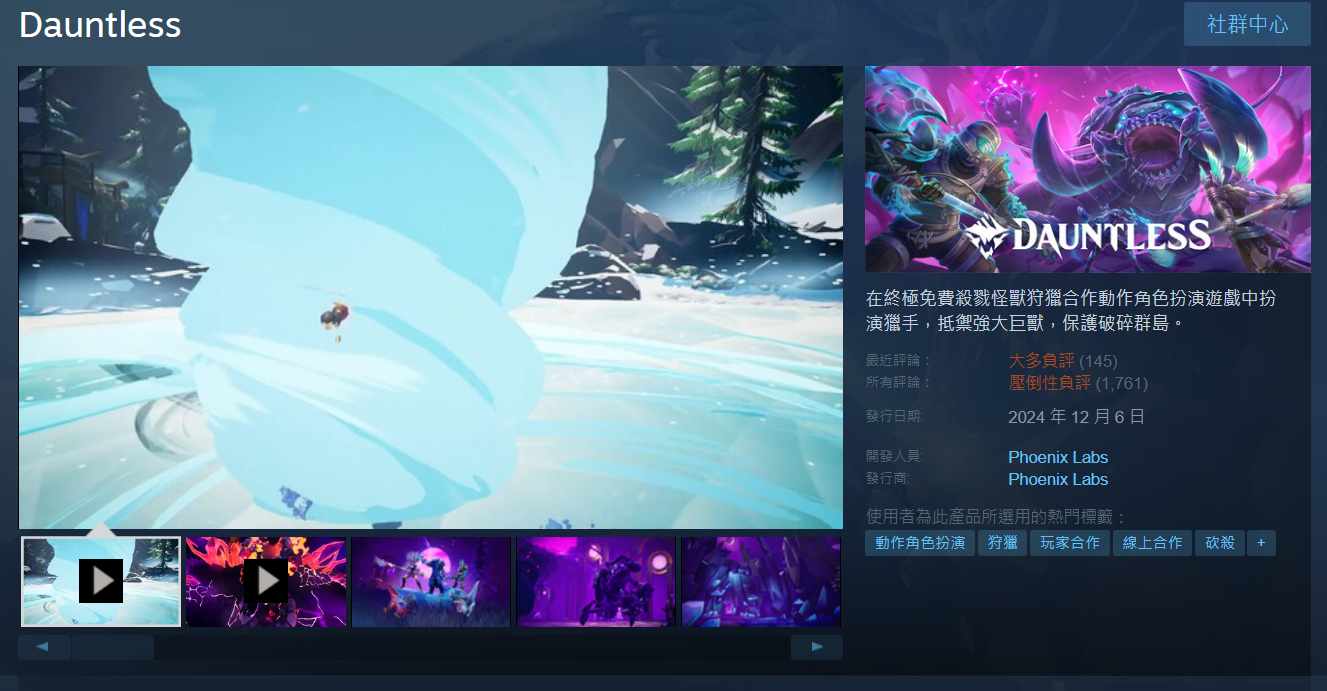 由 Phoenix Labs 開發兼發行,現正於 PC(Steam/Epic Games Store)/Nintendo Switch/PS4/PS5/Xbox One/Xbox Series X|S 等平台以基本遊戲免費的形式營運中的 Co-op 協力線上動作狩獵遊戲《Dauntless》將於當地時間 5 月 29 日結束服務不再提供遊玩。