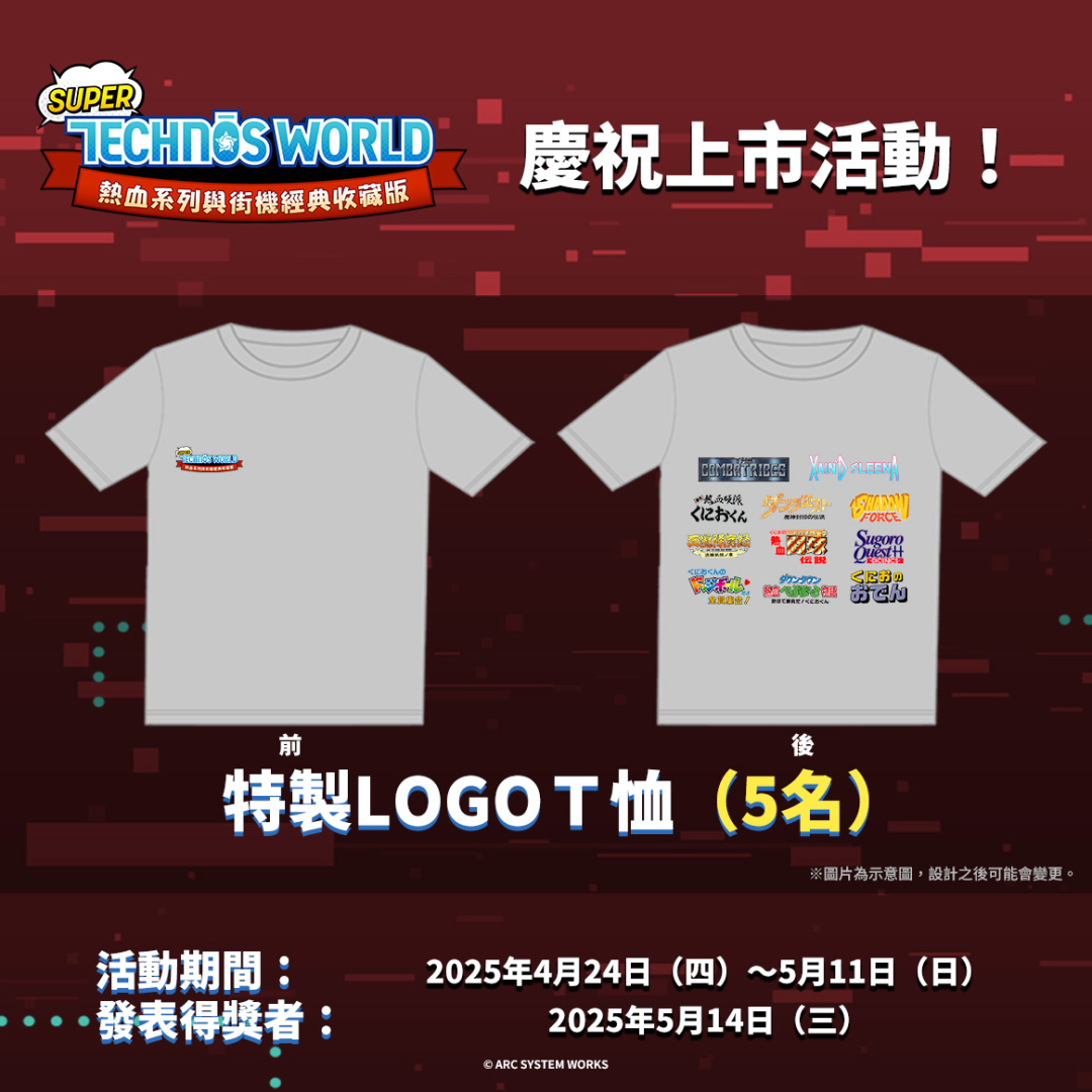為慶祝《Super Technos World 熱血系列與街機經典收藏版》中文版上市,從今天起舉辦抽獎活動。公開上傳購買認證照或是遊玩遊戲的畫面並留下關於本作的感想,就有機會得到「Super Technos World 特製LOGO T恤」。