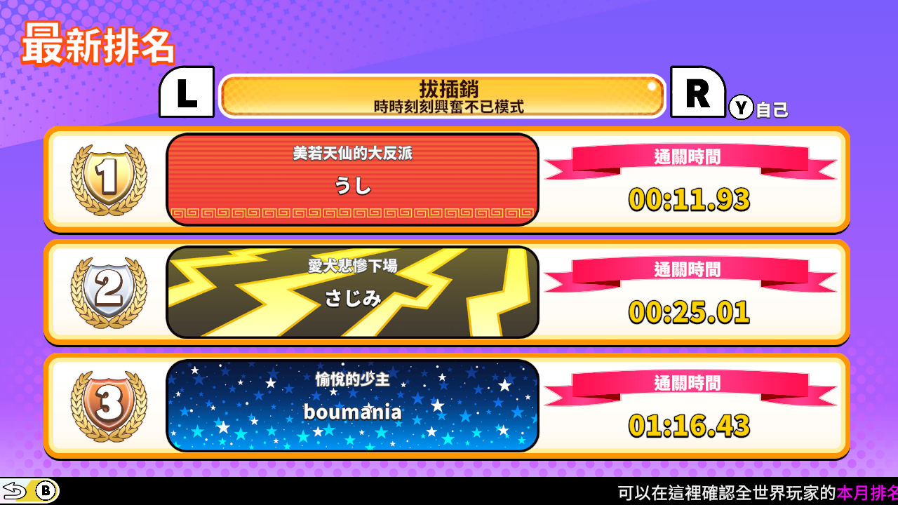 在小遊戲當中,每突破一關,就會解鎖當中的排行挑戰!排行方式有「完成時間」和「分數」兩種。準備好跟來自全世界的玩家一較高下,爭奪當月最高排名了嗎?!共有 7 個排行榜,其中的 6 個是用來顯示玩家在 6 個小遊戲當中的各別排名,剩下的 1 個是用來顯示玩家在 6 個小遊戲當中的合計排名。每個排行榜又細分為 3 個等級「簡單、中等、困難」。排名在每月初會重置。