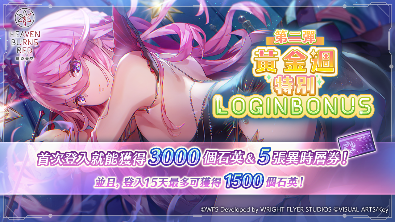 2025 年 5 月 2 日(五)10:00 起,舉辦黃金週 特別登入獎勵 第二彈!登入第一天即可獲得 3,000 個石英和異時層券×5!登入 16 天可獲得合計 4,500 個石英!