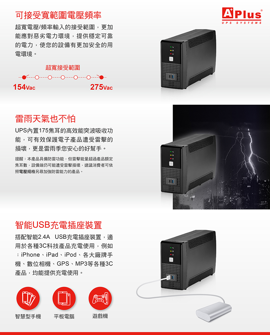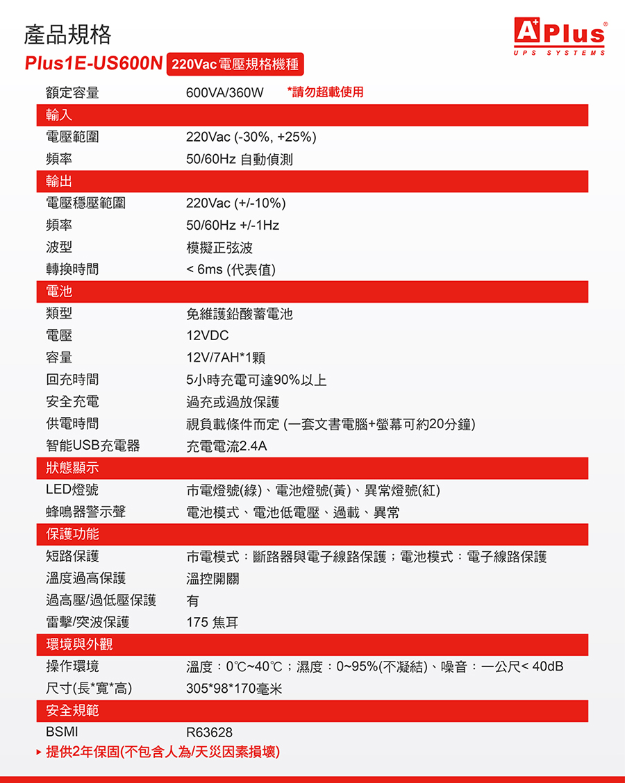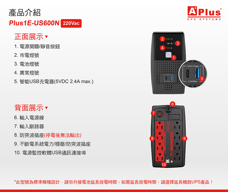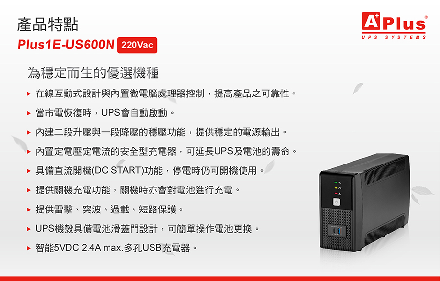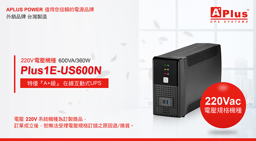 【特優Aplus】電壓220V 在線互動式UPS Plus1E-US600N(600VA/360W)